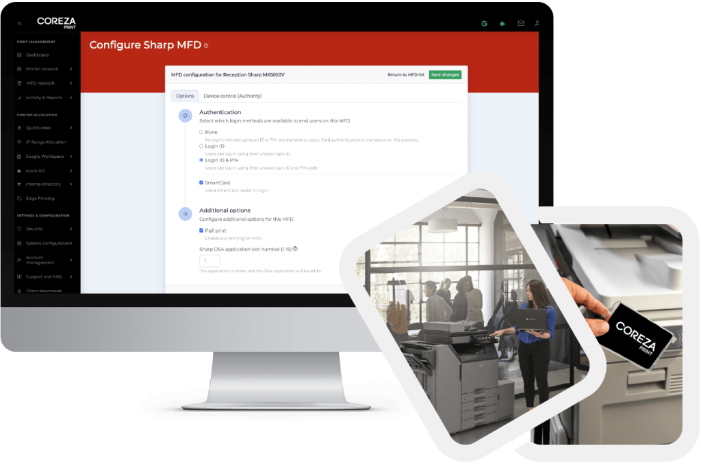 End-users can send documents to print from a PC or laptop, jobs are held in a single print queue until the user authenticates at any SHARP device to release them.