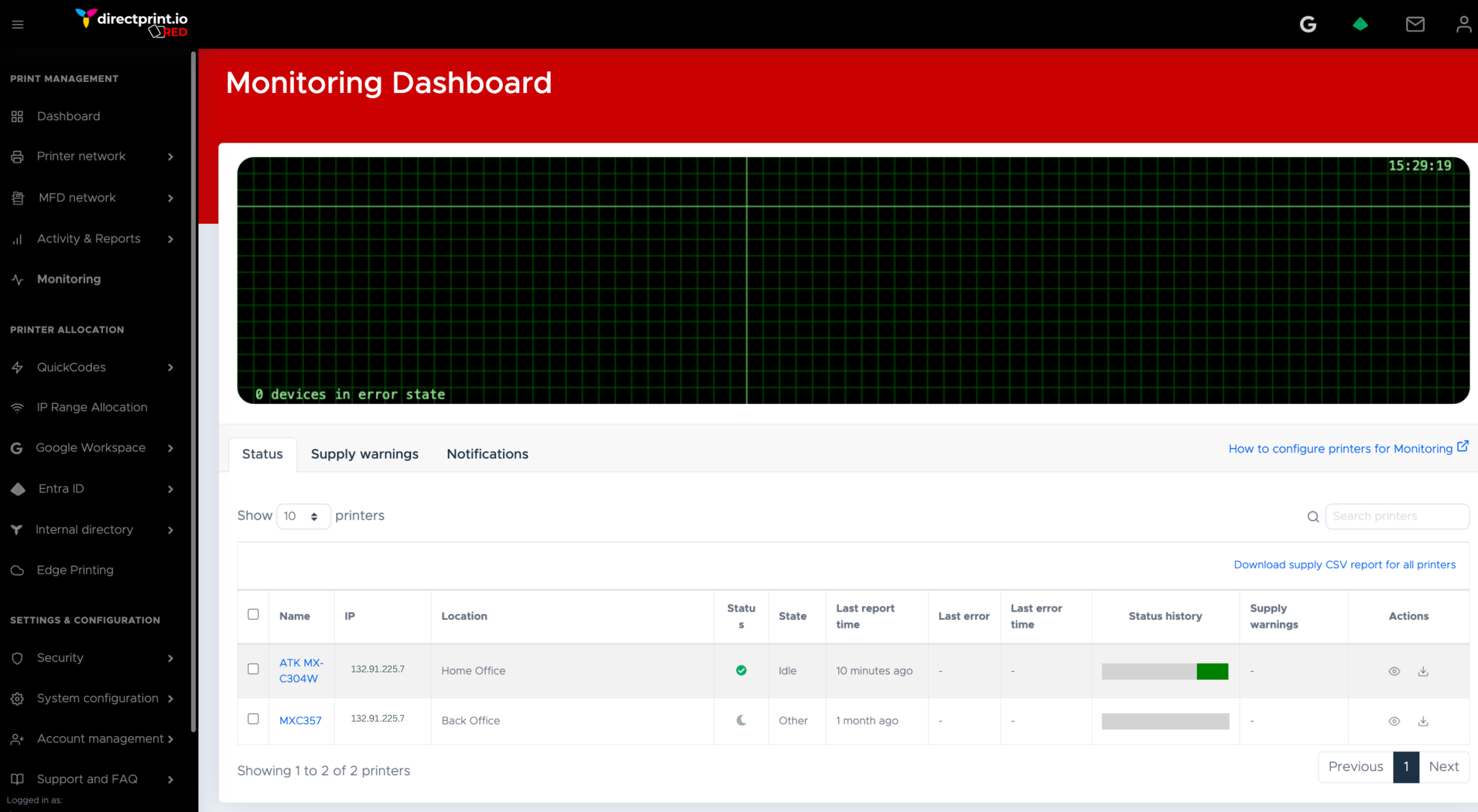 directprint.io RED provides a comprehensive overview of fleet performance, device status, supplies, and counters. IT leads can proactively resolve common issues such as paper jams or low toner levels before an end-user raises a support ticket.